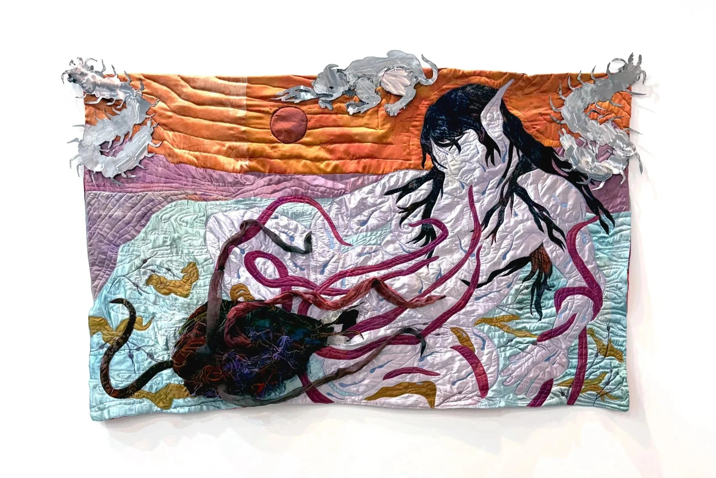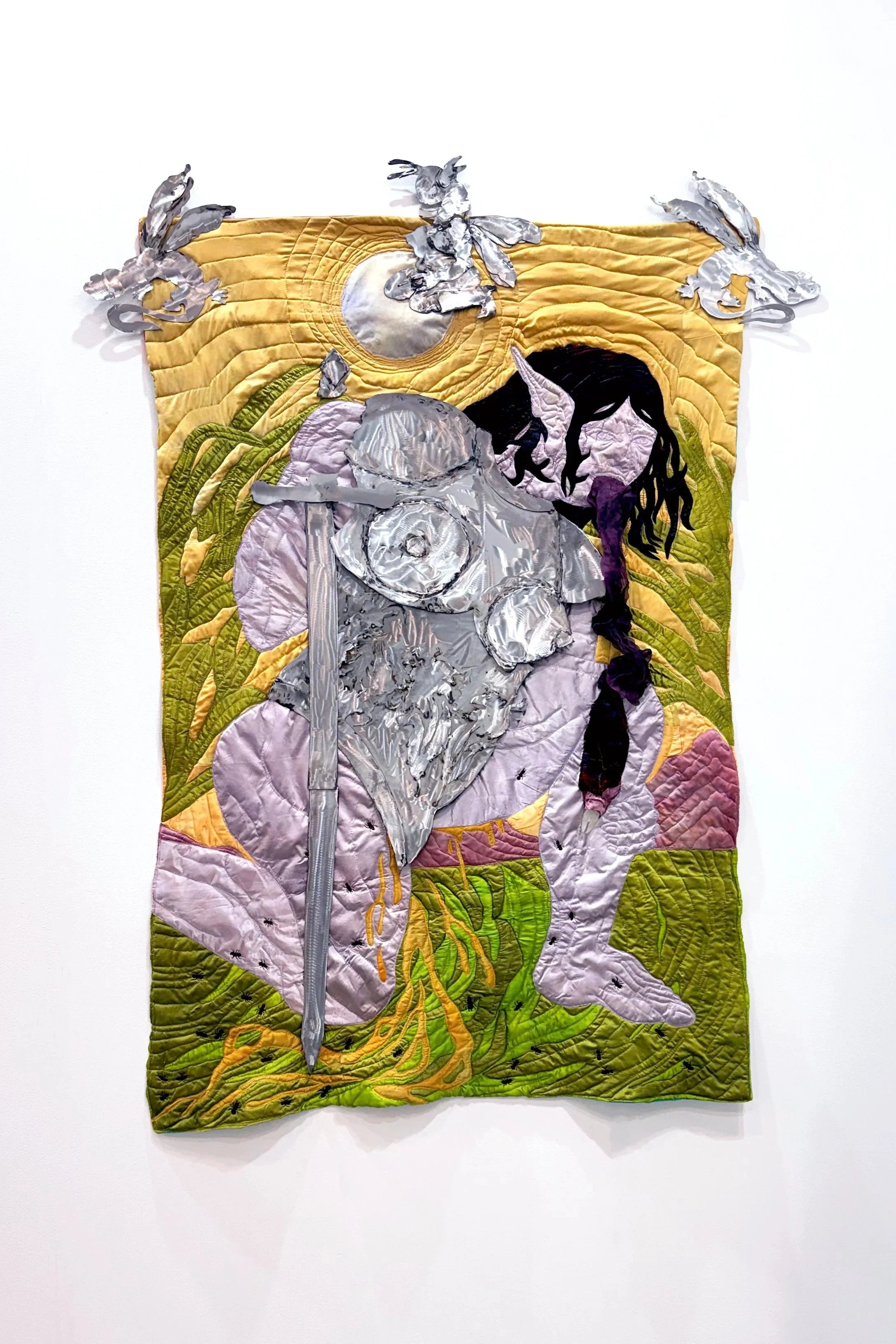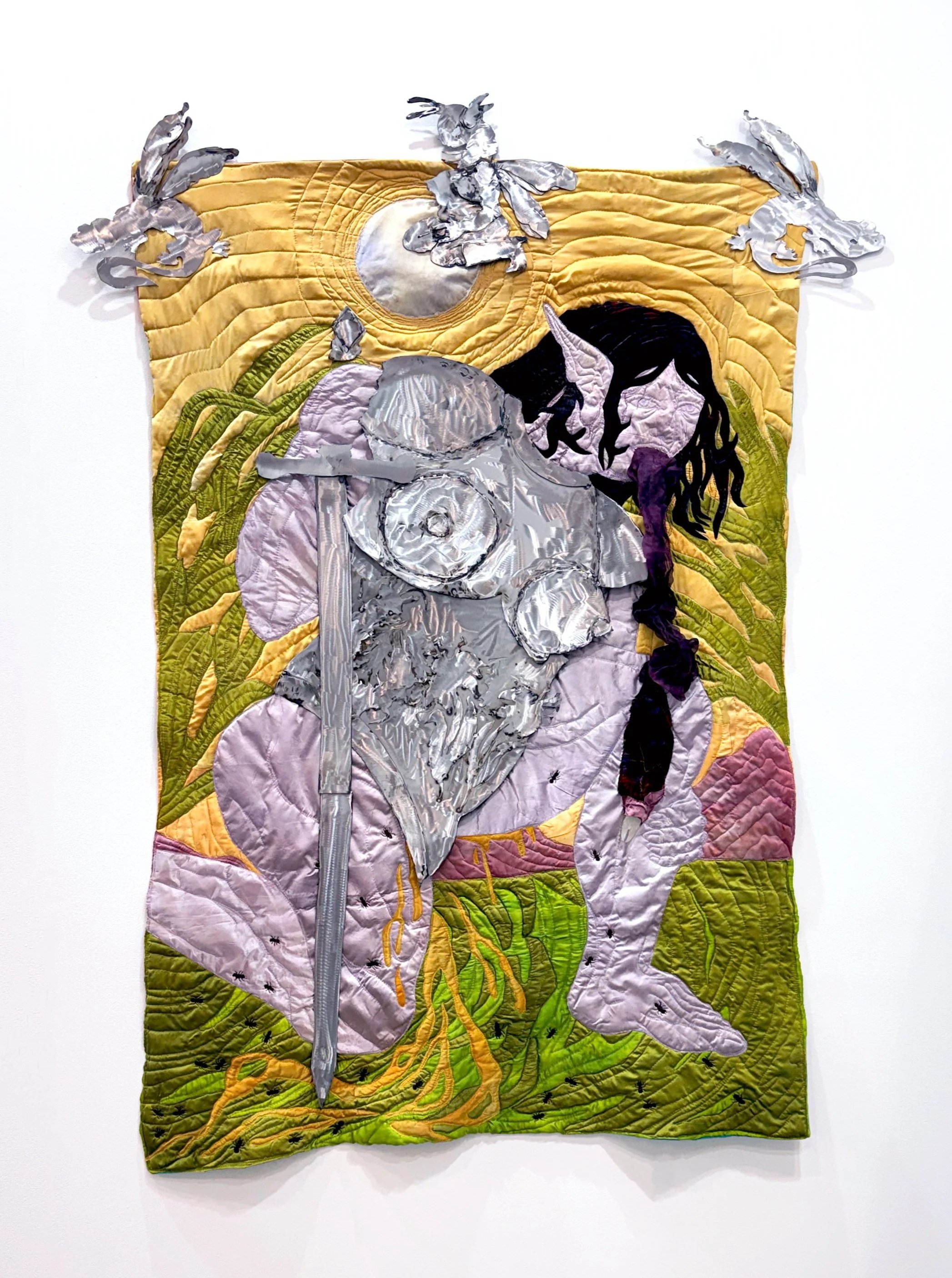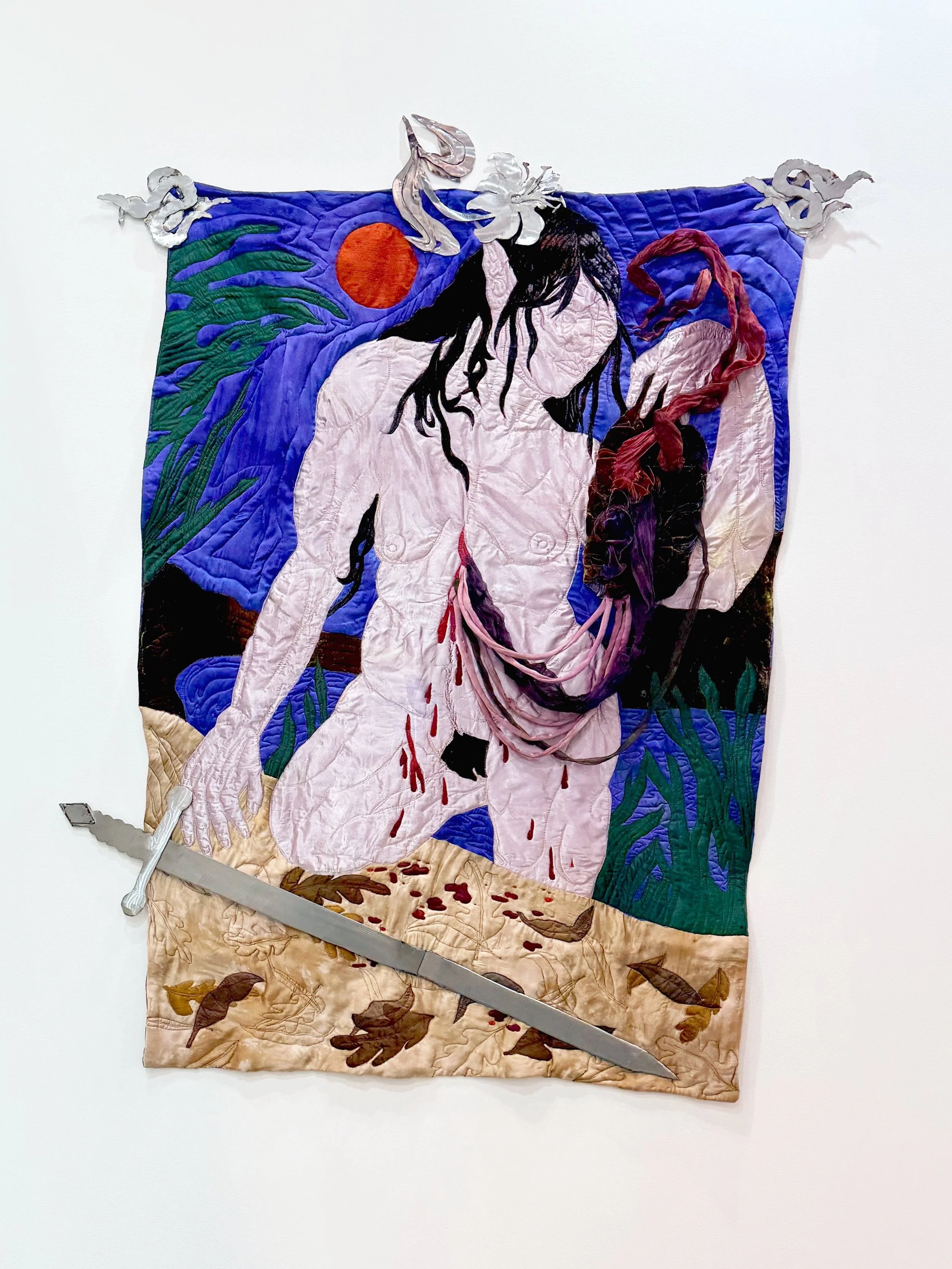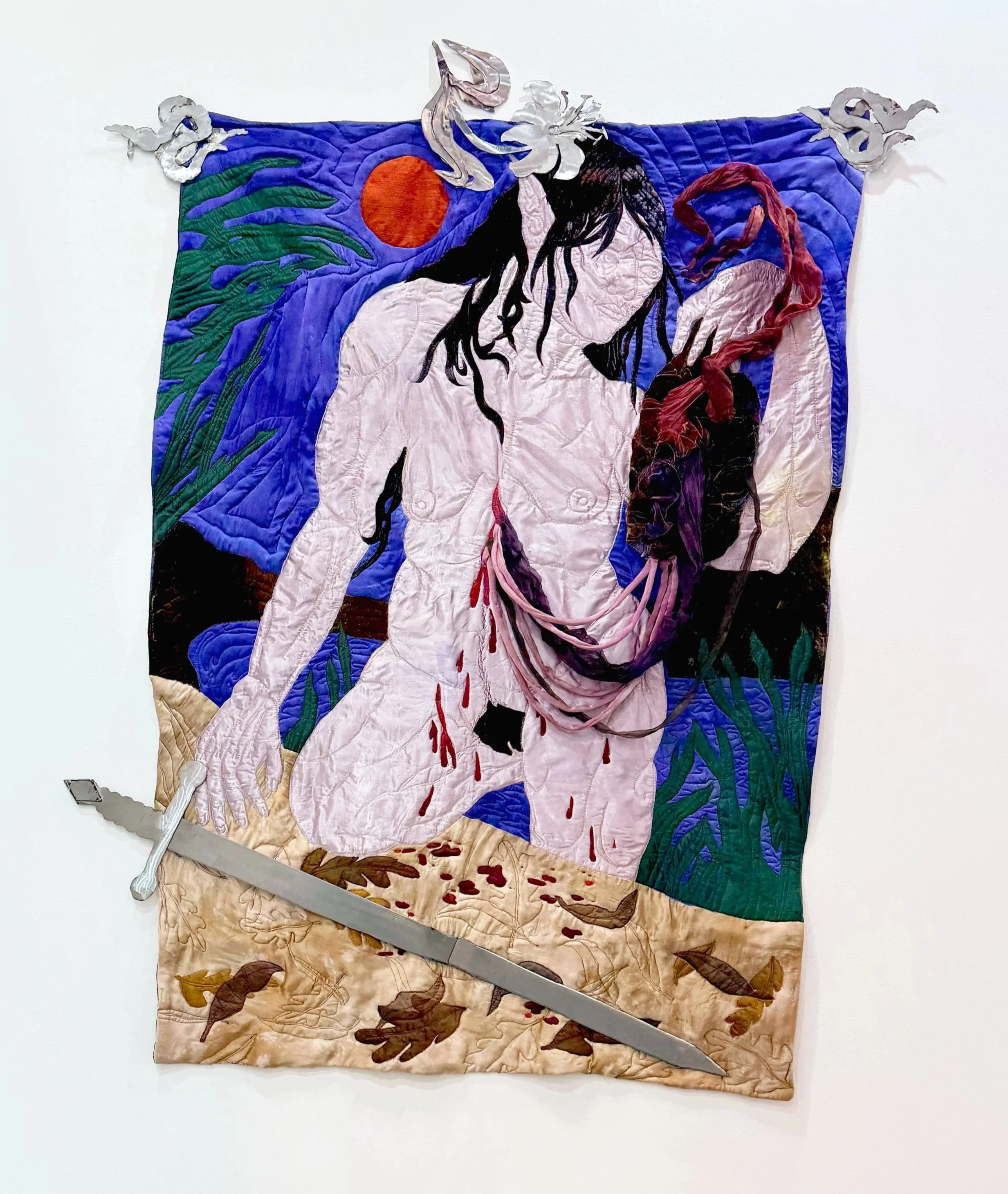 hand dyed silk and silk velvet, cotton thread, resin, steel